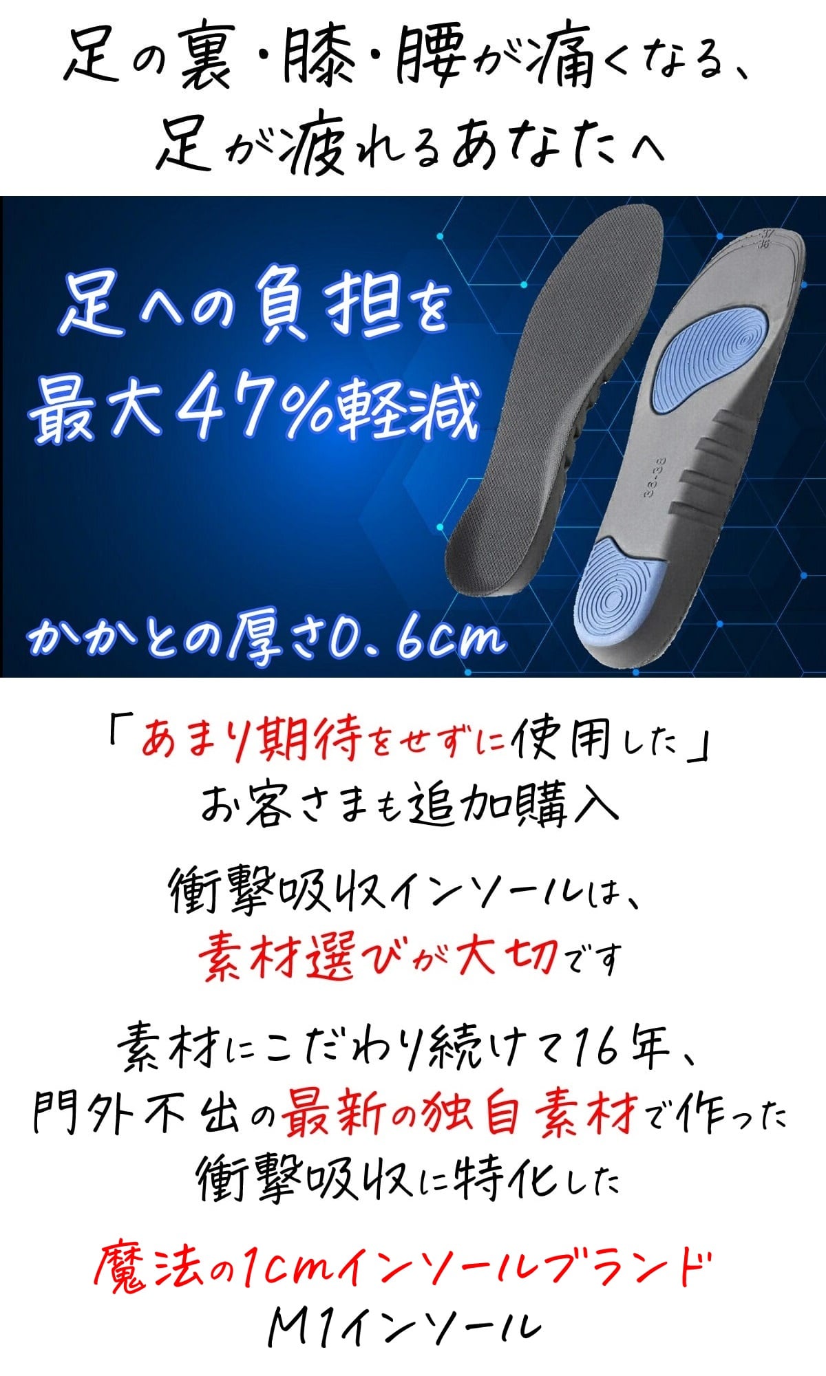 足への負担を減らす解決策が衝撃吸収力の高いインソールで、M1インソールは、独自の素材を使うことで、圧倒的な衝撃吸収力を実現しております。